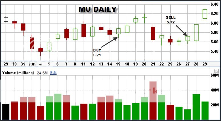 A small recap of the action. I bought 2000 shares of MU on 6/15. I knew earnings were going to be released on 6/20, and I took a gamble that they would meet of beat their estimate. On 6/20 they missed earnings by 0.12 and the stock "tanked" the next day down to 5.60. It also traded down into the 5.50s over the next 3 days.