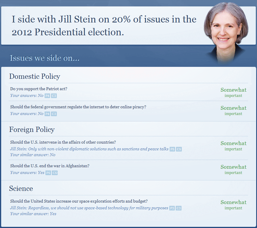 I looked at my Jill Stein results some more. I differ with her on NASA though and think it should be part of the military.