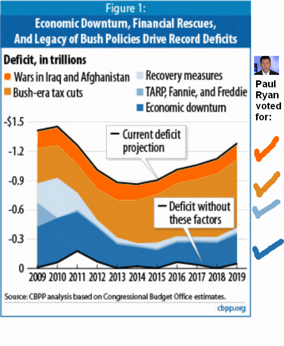 To: TimF who wrote (24677 ) 8/23/2012 9:33:33 PM From: Wharf Rat Read Replies (1) | Respond to of 85487 That's a lot of words to say "Tax cuts, 2 unfunded wars, and the unfunded Medicare D drug plan" Deficit hawk Ryan voted for all of them. It's cool, tho. In the second article, he's confessed, and been forgiven by Peter Robinson. Paul Ryan was for Big Deficits before he was against them (graphic) Posted on 08/12/2012 by Juan Paul Ryan blames President Obama for the government’s budget deficits, and singles out the stimulus program as the culprit. But stimulus was one-time expenditures, not ongoing annual ones, and so over time will contribute little to the deficit. What does drive up the deficit annually is a series of Bush-era measures, including the Iraq and Afghanistan Wars, tax cuts and unfunded medicaid prescription drug benefits, and the economic collapse that derived in some large part from extensive deregulation of the banking and financial sectors. Paul Ryan voted for every single one of the government measures that created the current deficits, and he opposes the obvious measures that would bring them down. He was opposed to the US withdrawal from Iraq . He opposes letting the Bush tax cuts on the super-wealthy expire. He opposes re-regulating the banks. Ryan wants to blame those deficits on President Obama, who was not even in the federal Senate when Ryan voted to spend a trillion dollars on an illegal and unjustified war on Iraq. juancole.com Medicare Part D and Ryan’s Misery By Daniel Larison • August 13, 2012, 9:59 AM Peter Robinson offers the weakest defense of Ryan’s terrible voting record I have seen so far: How can we defend him against charges that he’s at least part responsible for the mess we’re in? We don’t need to. Ryan himself has already recanted, demonstrating the remorse of the genuine penitent. Robinson has just shown that Ryan can’t be defended against charges that “he’s at least part responsible for the mess we’re in.” There’s no getting around the fact that Ryan voted for some horrible and fiscally irresponsible bills. As Jim Antle mentions in his article today, Medicare Part D added trillions to the government’s unfunded liabilities. The best defense Robinson can come up with is not to offer one, and instead point to evidence that Ryan regrets his votes. If we take Ryan’s regret seriously, that is proof that he is partly responsible. Indeed, if Ryan is sincere about how “miserable” he was back then, the report of his past misery confirms that he believes he was partly responsible. Ryan can claim to have been miserable about those votes all he likes. It doesn’t change the fact that the entitlement he voted to create is still there adding to the country’s long-term fiscal obligations. Of course, if Ryan were really “recanting,” he wouldn’t be using Medicare Part D to support his current arguments . He would be arguing for reducing or dismantling it.theamericanconservative.com