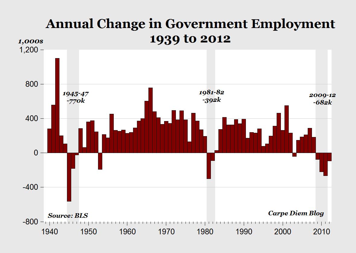 In fact, the contraction of government jobs since 2009 (almost 700,000) is the largest contraction in public sector jobs since the 1945-1947 period following WWII when government jobs contracted by 770,000 jobs, and almost twice the 392,000 government jobs lost in 1981-1982 (see bottom chart above).