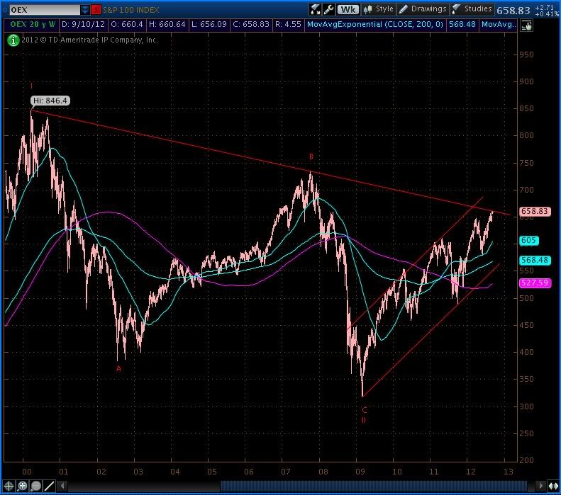 OEX is also flirting with the downtrend line that connects the 2000 (Wave I) high with the 2007 (B wave of II) high.