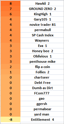 THE MARKET GURU OF THE MONTH LEADER BOARD FOR THURSDAY, OCTOBER 4TH... HAWKII STILL HOLDS THE LONE LEAD BY ONE POINT... ENTITLEMENT IS NOW BREAKING NEW RECORD LOWS FOR THE HIGHLY COVETED BOOBY PRIZE, MANY CONGRATS TO HIM FOR SUCH AN EARLY LEAD AND A JOB WELL DONE, I DON'T KNOW IF ANYONE COULD CATCH HIM NOW, BUT THE MONTH IS STILL YOUNG...