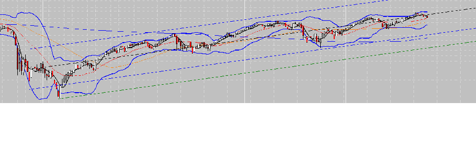 I used to draw trendlines like that but now I don't. Here is why. I think the regression analysis lines are more important. This is a weekly chart of the SPY and the green lines are just hand drawn by me by examination, starting the higher major low below the ultimate low and keeping the lines parallel. Using an actual regressional analysis tool, you get the same results as shown below the first drawing but did draw in the green line on the bottom and draw one in on top as it seems that my regression tool doesn't quite get the real important lower and higher trendlines. It really shows the outer possible limits for price moves with prices often getting to the outer limits especially on the upside. The bollinger bands do a much better job or predicting price reversals after 3 hits or so of the lower bollinger prices have reversed. The 200 wk moving average has also worked several times as well, that's the blue dashed line in charts. Support generally holds twice and fails on a third strike. If it's wrong, that's what stops are all about. I also have a theory that if say the lower trendline is hit, that the next correction won't retest it but will stop a third higher and then the next correction may retest. It seems to alternate. I see this more in stocks than in indexes. The best indicator of all is just riding the 5 wk moving average and staying in tune with it's slope at all times. No predictions are necessary and profits are dependent on the slope not changing direction enough. A simple formula can count up in hindsight the historical number of slope direction changes and as long as that number is sufficiently low, it's a winning strategy.