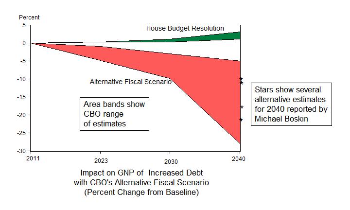 The following chart is a quick summary of his amazing findings. It shows the enormous decline in American income (measured by GNP) if fiscal policy follows the path we are now on as estimated by the Congressional Budget Office. The stars represent several different estimates for the year 2040 reported in Michael’s paper. The ranges show CBO estimates under current policy or under the House Budget resolution of last spring.