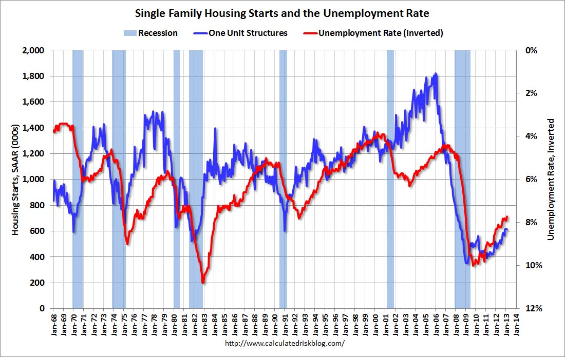 That is good news. I've been hearing and reading more and more that housing starts are improving. That to me is a very good sign as it feeds into the pipeline for housing in general and is important for a good foundational economic recovery. Check out the correlation of housing starts with the inverted unemployment chart. Shows the high correlation and shows improvement in both.