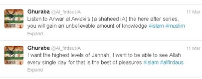 One interesting account Tsarnaev followed is "Ghuraba" (http://twitter.com/Al_firdausiA), an account aimed at providing "Islamic insight" to English-speaking Muslims in the west. The term Ghuraba ("strangers") is a popular concept among Muslims in Western countries, as it speaks to their feeling of being outsiders in the societies they live in. In one instance, Ghuraba tweeted a recommendation to listen to the sermons of Anwar Al-Awlaki: "Listen to Anwar Al-Awlaki (a shahid iA) [a martyr, Allah willing], the hereafter series, you will gain an unbelievable amount of knowledge." Another tweet on the Ghuraba account reads: "I want the highest levels of Jannah [paradise], I want to be able to see Allah every single day for that is the best of pleasures."