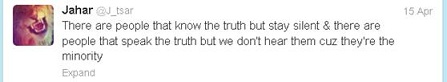On the day of the bombing Tsarnaev tweeted: "There are people that know the truth but stay silent & there are people that speak the truth but we don't hear them cuz [because] they're the minority."