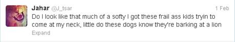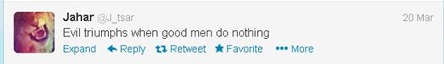 Dzhokhar Tsarnaev's Twitter AccountIn general, the impression from Dzhokhar Tsarnaev's Twitter account (@j_tsar) is of a regular American college student. The younger Tsarnaev rarely tweeted about Islam or politics. However, in hindsight, some tweets appear meaningful.