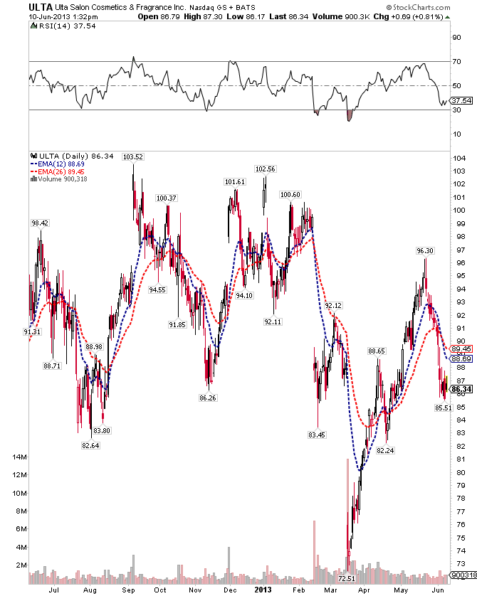 To: golfer72 who wrote (14148 ) 6/10/2013 2:34:37 PM From: John Pitera Respond to of 33421 To: John Pitera who wrote (4 ) 6/10/2013 2:12:06 PM From: John Pitera of 5 ULTA-- Reporting this week, GS downgrades... another firm says buy prior to earnings Cramer in his CNBC mad dash prior to the open this morning starts off talking about 3 stocks, the first one is ULTA-- Ulta Salon, Cosmetics & Fragrance, Inc. (ULTA) Cramer describes it as a barometer of high growth, high multiple stocks and thus it may have predictive value for those types of companies that have been one of the cornerstones of this ebullient bull market period of the past couple of years and especially since last Summer and Particularly kicking into Turbo Warp Overdrive in November when the Bank of Japan and the Japanese Government went beyond all in at the Last Chance Saloon of 190 proof Quantitative Easing which they cubed (grade school math operation.....) with direct purchases of equities, ETF's and other assets .... even the wallpaper on the walls as Art Cashin so Aptly put it.... -vbg- Ok so let's go to the chart on ULTA......... It is bad....... (still working on the formating when inserting pictures and when using the quotation boxes),,,,, and I am more from the John Lennon school of ...ok we have a take...I don't bloody care if it's a little rough, I'm going to go have a smoke and chase down those bits that I left up town ......... (kids, do not try this at home, for entertainment purposes....no....instructional.......my lawyer is demanding boilerplate verbiage.... always consult your Financial Advisor, CPA and Tax attorney and only do what they all sign off on in triplicate....) so we can not always be so nimble in trading and investing.... which brings me to the weekly chart of ULTA........ the weekly chart is way back up at the top... It is a broken stock...... One of my very best indicators which I normally hide.... or make people consult with me and pay me money to explain this stuff for them is the Moving Average Cross over system on the RSI... as you Know Welles Wilder developed the 14 day Relative Strength Index in his late 1970's book.... in Calculus terms.. the RSI is a derivative since it is derived first from the daily price close and then the 14 day average of the last 14 trading days and then it is calculated to reflect a number between zero and 100. back in the stone age before we had PC's this stuff took a lot of work..... people that I have worked with used slide rules.....once upon a time....anyway.... now life is easy in theory.... we can now with a requisite amount of programming knowledge and a really STRONG grasp of what it is we are looking for in this sea of info.. we can go back to the chalk board and trying to figure out how we were ever going to use a second or 3rd derivative.... I personally thought it was complete nonsense... I was not working for NASA and building ICBM's.... but it turns out that when we put some different moving averages and exponetial moving averages and calculate them on the 14 day RSI some interesting things emerge when we have the really good systems programmers run through all the data. We have found that the 45 day EMA is usefully and when the 9 period EMA goes beneath the 45 period it got us short ULTA at 98.46.... kept us short at the all time high of 103.25 last August and still has us short...on the weekly chart.... the daily and 6 hourly time periods ..... help to fine tune entry points. BOTTOM LINE POSITION TRADERS ARE EITHER SQUARE OR SHORT THIS STOCK. JJP