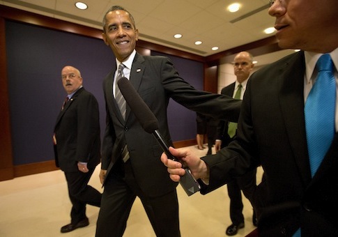 What is most striking about these questions is how many of them concern an upcoming personnel decision that, while significant to the economy, is at the moment of interest only to squabbling factions of liberals. Here too the circuit cannot be broken. Most of the other questions are constructed so as to provide the president an opportunity to attack the GOP and restate his accomplishments and goals. Edward Snowden, Lois Lerner, James Rosen, Mohamed Morsi, Bashar Assad, Nouri al-Maliki, Vladimir Putin, Hasan Rouhani, and Hamid Karzai are not mentioned. Eliot Spitzer, Anthony Weiner, and Bob Filner are not mentioned. Indeed, hardly a single event or personality that has occupied the public imagination over the last six months is mentioned. The exception is Trayvon Martin, who the president references toward the end of the exchange. The only other proper names to appear in the transcript are Larry Summers, Ben Bernanke, John Kerry (in relation to the Keystone Pipeline), Robert Putnam, “Jackie,” and “Mike.”