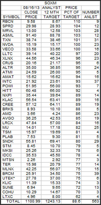 Bottom line number for the amount the 12 month target price exceeds the week's closing price is 88.6 this week versus 91.3 last week. Only 5 stocks this week are above the 100 mark for price percent of target.