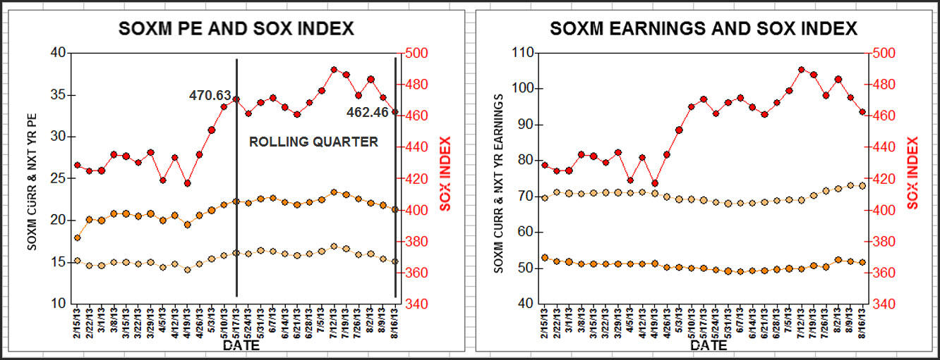 Respond to of 95530 This is the weekly update of the SOXM and SOX tables in terms of week end earnings estimates and earnings estimate changes from last week for the SOXM stocks, price and price changes for the SOXM and SOX indices, and updates for the weekly Cur Yr, and Nxt Yr PEs, and PEGS for the SOXM. Also shown are 2 charts showing the SOX index along with Cur Yr and Nxt Yr earnings estimates and PEs. Both the SOXM and SOX indices were down this week continuing the downtrend started last week. From the start of the table, 2/15/13, the SOXM is up 4.2 percent, and the SOX is up 7.9 percent. The table shows precise values and changes from week to week in actual and percent form for the SOXM and SOX indices. This makes it easy to see the different periods and characteristics of the market as the weeks go by. Take for instance, the "4" weeks in May when the market was really trending upward hot and heavy. A more recent time frame is the 3 weeks from 6/28 thru 7/12 for the SOX sending the SOX up almost 30 points or about 6 percent to hit the peak in the table of 489.61. In the last 2 weeks, the SOX has fallen nearly 20 points. For the last 5 weeks from 7/12 the trend has been down. Now on to the charts. I added a couple of vertical lines to the PE chart to show this week's 13 week rolling quarter. At the beginning of the 13 week period, the SOX index was 470.63. This past week it closed at 462.46(-1.7%). The first 5 weeks of the period had a flat to slight downward trend, then 3 strong up weeks, and recently 5 weeks of a downtrend. Earnings estimates and PEs have been relatively flat over the period.