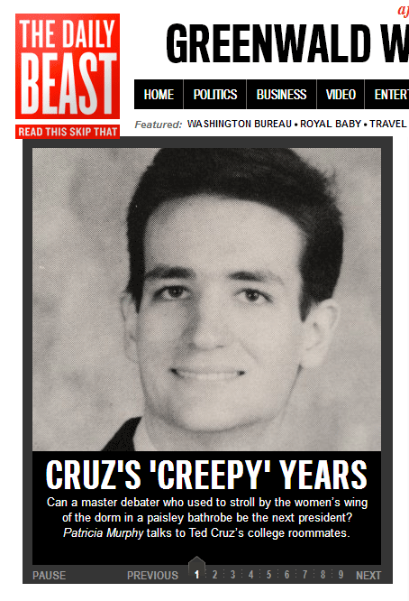All of this was neatly packaged on The Daily Beast’s front page under the headline “Cruz’s ‘Creepy’ Years,” posing the question to its readers: “Can a master debater who used to stroll by the women’s wing of the dorm in a paisley bathrobe be the next president?”
