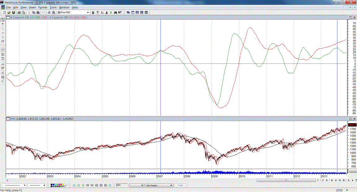 The comparisons between now, and the move from 03 to June 2007, are very similar now, in some ways, in this indicator graphed above, the Coppock 140 in green and 280 in red.