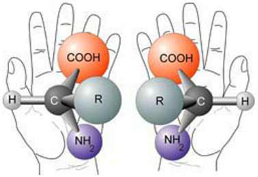 Life is made of chiral molecules. A chiral molecule can be left-handed or right-handed. Below is a picture of two chiral molecules, the left-handed molecule is the left-handed form of an amino acid found in life: