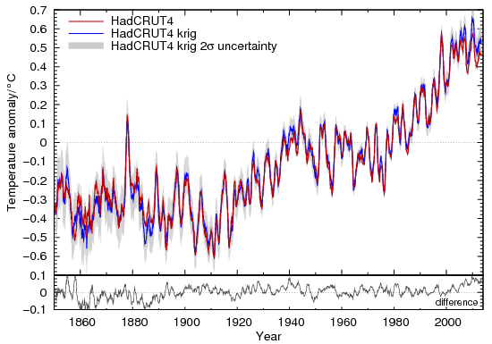 Read Replies (1) | Respond to of 86356 If we had 15 years with no increase, '05 and '10 wouldn't be hotter than '98. Cowtan and Way: Surface temperature data updatewww-users.york.ac.uk Posted on 27 January 2014 by Kevin C Following the release of temperature data for December 2013 , we have updated our temperature series to include another year. From now on we hope to provide monthly updates. In addition we have released the first of a new set of 'version 2' temperature reconstructions. Version 2 temperature reconstructionsOne of the main limitations of Cowtan and Way (in press) , which we highlighted in the paper and has been echoed by others, is that the global temperature reconstruction was performed on the blended land-ocean data. The problem with this approach is that surface air temperatures behave differently over land and ocean, primarily due to the thermal inertia and mixing of the oceans. The problem is compounded by the fact that sea surface temperatures are used as a proxy for marine air temperatures due to problems in the measurement of marine air temperatures. We have therefore started releasing temperature series based on separate reconstruction of the land and ocean data. The first of these 'version 2' temperature series is a long reconstruction covering the period from 1850 to the present, infilled by kriging the HadCRUT4 land and ocean ensembles. (We can't produce a hybrid reconstruction back to 1850 because the satellite data only starts in 1979.) For the long reconstruction there is no need to rebaseline the data to match the UAH data, and so all the original observations may be used. The separate land/ocean reconstructions also address a small bias due to changing land and ocean coverage which was mitigated by the rebaselining step in our previous work. The use of the ensemble data means that we now produce a more comprehensive estimate of the uncertainty in the temperature estimates (following Morice et al 2012 ). The coverage uncertainty estimate has also been upgraded to capture some of the seasonal cycle in the uncertainty. A comparison of the temperature series to the official HadCRUT4 values is shown in Figure 1.Figure 1: Comparison of HadCRUT4 to the infilled reconstruction, using a 12 month moving average. We have also updated the version 1 infilled and hybrid reconstructions to the end of 2013. These will be frozen at that point and replaced by new version 2 hybrid reconstructions. Results for 2013The annual temperature averages for the version 2 infilled data are shown in Figure 2.Figure 2: Annual temperatures for the version 2 infilled reconstruction Rankings of the hottest years are as follows:Rank HadCRUT4 Version 2 infilled Version 1 hybrid 1 2010 2010 2010 2 2005 2005 2005 3 1998 2007 2009 4 2003 2009 2007 5 2006 2013 2013 6 2009 2006 2002 7 2002 1998 2006 8 2013 2002 2012 9 2007 2003 2003 10 2012 2012 1998