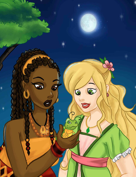 Princess Vinnea, guardian of plant life (left), and Princess Terra, protector of the land, examine one of many "gulavores" plaguing the land of Hortensis in the children's book Princess Vinnea and the Gulavores.