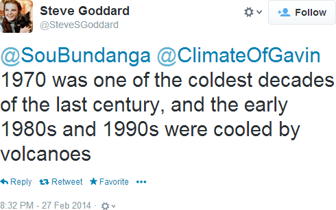 Cold hobby horse As I recall, my foray into tweet-weird started with one of the nuttier nuts, "SteveSGoddard", who replied to my tweet about the new paper by Gavin Schmidt and colleagues. Steve (not his real name) claimed: