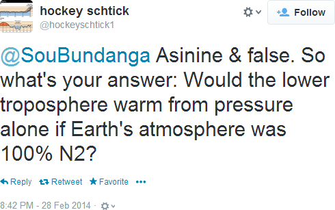Sky dragon hobby horse Steve Goddard eventually got bored and stopped responding. I guess he didn't like his silliness being broadcast beyond his normal audience of science deniers. However another wacky science denier took over. This one goes by the name of hockeyschtick1. Now hockeyschtick1 is another a gish galloper and wandered all over the place in his/her denial of science. Over time it became apparent that s/he is a "slayer" and doesn't accept the greenhouse effect. Hockeyschtick1 at one point tweeted: [iframe width="500" height="290" title="Embedded Tweet" class="twitter-tweet twitter-tweet-rendered" id="twitter-widget-2" frameborder="0" scrolling="no" style="border-width: 1px; border-style: solid; border-color: rgb(238, 238, 238) rgb(221, 221, 221) rgb(187, 187, 187); margin: 10px 0px; padding: 0px; display: block; visibility: visible; position: static; min-width: 220px; max-width: 99%; borderRadius: 5px; boxShadow: 0 1px 3px rgba(0, 0, 0, 0.15);" allowtransparency=""][/iframe] Given that hockeyschtick1 has heard of Henry's Law, you'd have thought s/he would be asking themselves why the oceans continue to absorb a lot of the extra CO2 we are emitting, what with the partial pressure from CO2 increasing. But no. Hockeyschtick1 couldn't manage to concentrate long enough for that, quickly moving to arguing that nitrogen is causing global warming. At least that's what it appeared to be.