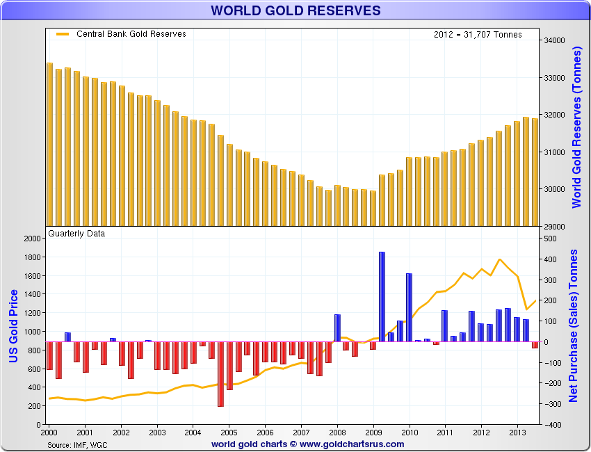 To: Goose94 who wrote (5915 ) 3/22/2014 8:40:09 AM From: Goose94 Read Replies (1) | Respond to of 202706 Here's a look at the 20 largest holders of gold on the planet according to the World Gold Council report in January 2014. 1. United States - 8,133.5 tonnes While the US permanently abandoned the gold standard in 1971, it has the largest holdings of any single country by a wide margin.The growth of the Federal Reserve’s balance sheet can only be sustained without dire consequences if it is backed by hard assets like gold. While most of the gold is held at Fort Knox in Kentucky, gold is also held by the US Mints in Philadelphia and Denver and several other locations. Imagine if the "conspiracy" theorists are right and that Fort Knox and other repositories do not have gold in them. It is this gold, the massive U.S. GDP and America’s underlying wealth of natural resources that keep the dollar as the world’s reserve currency. 2. Germany - 3,387.1 tonnes Germany's central bank, the Deutsche Bundesbank in Frankfurt, is the manager of the country's reserves. However, reports have surfaced that the bulk of Germany's gold is in the physical custody of the New York Federal Reserve. The Bundesbank said a year ago it will repatriate 674 tons of gold from vaults in Paris and New York by 2020 to restore public confidence in the security of Germany’s reserves. But in the first year of the plan, Germany only received back 5% (37.5 metric tonnes) of the total repatriation amount. 3. International Monetary Fund (IMF) - 2,814 tonnes The IMF overseas the economic activity of its 187 member countries around the globe. While its gold policies have changed over time, the reserves are intended to aid national economies and stabilise international markets. Depending on market conditions, it will buy or sell portions of its reserves in support of specific economic initiatives. How Much Gold Does China Really Have?China is the biggest gold consumer and producer in the world. But Beijing does not publish gold trade statistics, and there are substantial volumes entering the country unrecorded, through Shanghai and gray routes. There is no recent official data about Chinese central bank gold holdings, as the institution last announced its gold holdings in April 2009, at 1,054 tons. China is also encouraging its people to place some portion of their personal wealth in precious metals. How much gold has the People's Bank of China accumulated since 2009, when China gave its last official gold holdings update ? One thing is certain: it is well more than the official number of just over 1000 tons. China may be buying gold to diversify its foreign reserve holdings away from its heavy exposure to the U.S. dollar, which accounts for the vast majority of its foreign reserves. Changes in World Gold Official Reserves :
