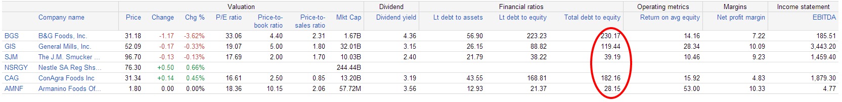 Respond to of 78750 Re: B&G Foods Inc. (BGS) - Armanino Foods of Distinction Inc. (AMNF) is a much better "Value" buy. I like this sector (Processed Food & packaged good) and think it will be somewhat defensive if/when interests rates rise. Therefore, going into such an environment, Long Term debt must be as low as possible since their pricing power may be limited. I compared five companies in this sector to get an idea how BGS's LT debt compares and for me it's still too high but manageable. From the list I currently own NSRGY but it may be a sell candidate because of valuation and just added shares to AMNF. I also have owned CAG and have that one on my buy list at $28.00/share or lower. If you look at the 2012-1014 time period AMNF is the best performer (by a factor of 3x) but for the large Caps stocks, BGS is still one of the better performers, while CAG is the lager. The positive is BAG is the smallest of the group, 6x smaller than SJM, when you exclude the micro-cap. Armanino Foods of Distinction Inc. (AMNF). I am not too sure that bigger is always better. My favorite is still AMNF mainly because of their low debt profile, consistent revenue growth YoY of 10% or more and a 10 year history of dividend payments.goo.gl (Note: you need to slide the time line bar under graph to get a better picture of price performance) Maybe I would consider SJM at a 20% lower price. That would bring it more in line w/ AMNF's debt profile and dividend. The PE's for these are all quite high but of the group I think AMNF could grow revenues that justfies their 18x PE. FWIW, my last buy for AMNF was last week at $1.63/share, when some fund must have sold a chunk of their shares before the earnings report. I upped my holding by 15%. At that price I locked in a 4% dividend and PE at 16. For me, one of my best buys of 2014. Thank You for your alert on AMNF at the Dividend investing for retirement thread. EKS