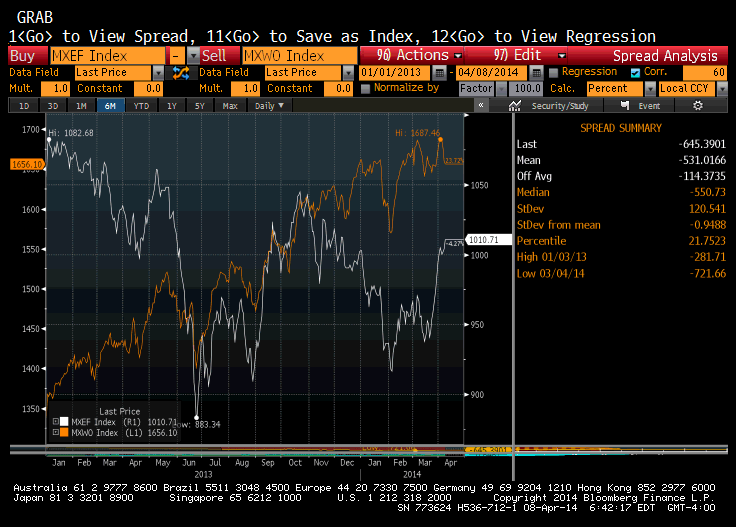 To: ggersh who wrote (105848 ) 4/26/2014 4:00:53 AM From: elmatador Read Replies (1) | Respond to of 217740 This Great Graphic, created on Bloomberg, depicts the MSCI equity index for the developed countries (orange line) and the emerging markets (white line). Great Graphic: New DM-EM Equity ConvergenceAuthor: Marc Chandler · April 8th, 2014 This Great Graphic , created on Bloomberg, depicts the MSCI equity index for the developed countries (orange line) and the emerging markets (white line). The charts begins at the start of last year. In the first several months of 2013, DM outperformed EM. The big EM sell-off coincided with first hint from the FOMC about tapering. EM recovered and tracked the DM until October. A new phase of divergence, with DM outperforming again lasted into early March.Since mid-March the performance is a study in contrasts. MSCI emerging market equity index is up about 8.4%. During the same time the developed markets index is up a little less than 1%.In the foreign exchange market over this period, the dollar-bloc is the strongest. The Australian dollar is easily the best performer rising 3.3% against the dollar, followed by the Canadian dollar (1.7%) and the New Zealand dollar (1.5%). Sterling is a distant fourth, up 0.4%, and all this was recorded today. The other major currencies have lost ground against the dollar this period.Among the emerging market currencies, the Brazilian real (5.8%), Colombian peso (5.5%) and Turkish lira (5.5%) have led the advance. Chilean peso (3.5%) and the Russian rouble (3.0%) round out the top five. As with the majors, the high yielding/high beta currencies has generally outperformed.This piece is cross-posted from Marc to Market with permission.