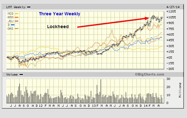 Very nice selection with Lockheed. The board (JimisJim & Mannie added LMT 2/2013 at $90.00/share. This was the SA article posted at the time.) . It was noted that they had a good record of increasing dividends. At that time the dividend was yielding 5.2%. Who would of known that it had an 80% run higher in it.