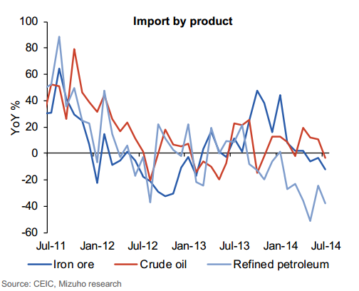 The China factor is key for commodity-reliant exporters China’s trade surplus rose to a record US$47.3bn in July after exports jumped 14.5 per cent while imports fell 1.6 per cent. The weakness in imports was largely due to lacklustre demand for crude oil, refined petroleum products, iron ore and copper, imports of which fell 3.7 per cent, 38 per cent, 12.1 per cent and 15.6 per cent respectively in July (see chart).
