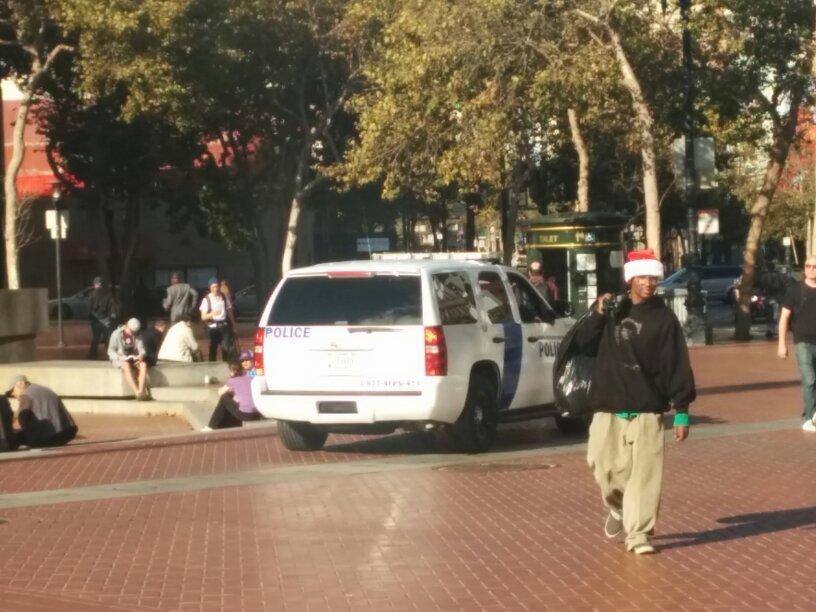 Police SUV driving on sidewalk but not much else going on. KTVU crew wonders where protesters are. #DayOfRage
