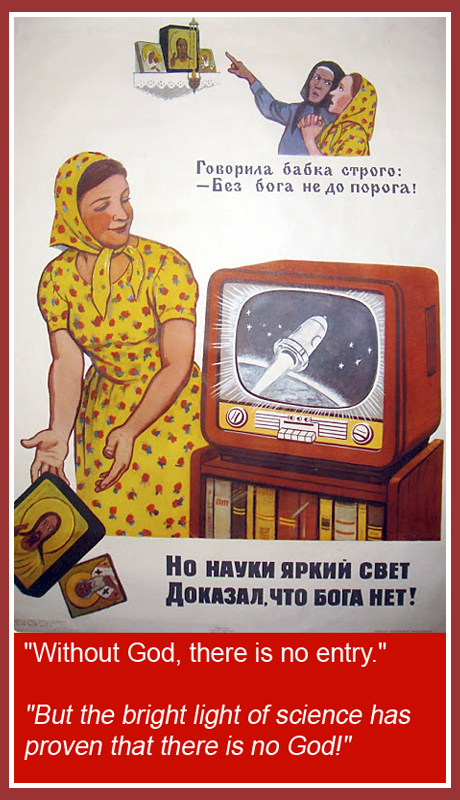 A poster from 1965 shows a young woman throwing out her icons while she watches a satellite in space on television. The poster says, “the bright light of science has proven there is no God.”