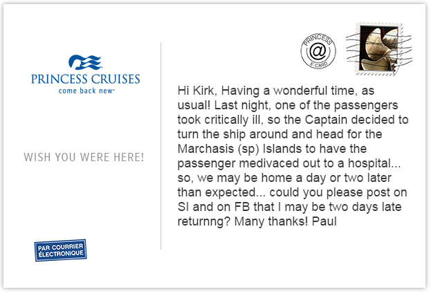 Cool idea by Princess to send post cards for cruisers where the recipients have to read their web site ads to get your message!