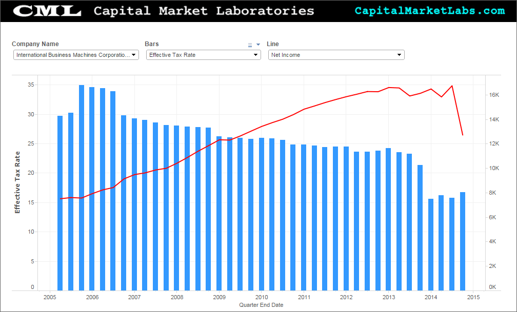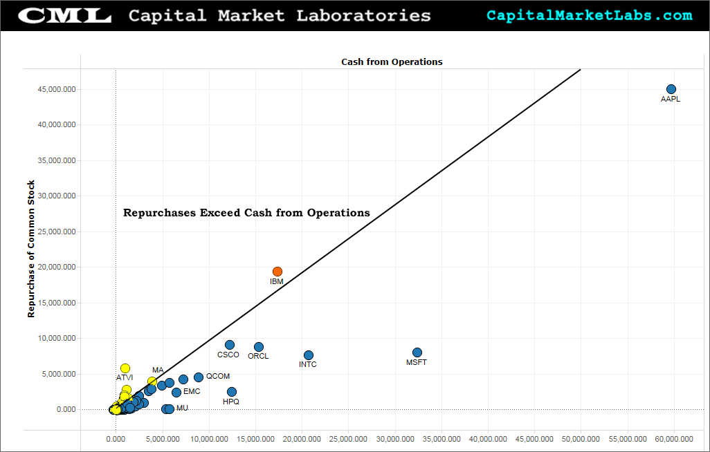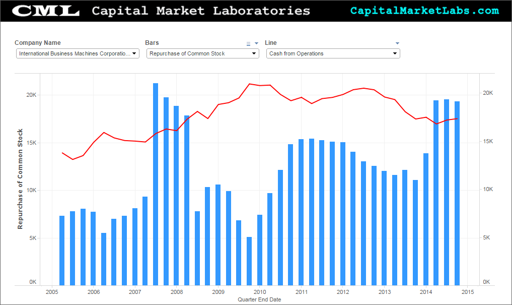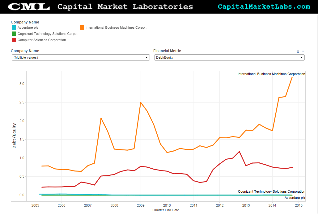 To: Fintas who wrote (1583 ) 1/13/2015 11:03:53 PM From: toccodolce Read Replies (1) | Respond to of 4369 Second, re IBM.. shhhh don't be pointing out investing is more than TA. The other doozy is that IBM borrowed money to fund their share buybacks :)In 2010 IBM's debt to equity ratio was around 1.2ish and now it stands closer at a 3.5 ish. HEE HEE. Toccobenzinga.com IBM's Lost Decade In 7 ChartsThe graphs below were produced by Capital Market Labs . The old adage is that "no one ever got fired for hiring International Business Machines Corp. IBM 0.24% ." For decades, "Big Blue" was the gold standard for technology companies and a reliable investment. Yet over the last two years, IBM is down over 17 percent, while at the same time, the S&P 500 has risen nearly 40 percent and the NASDAQ over 50 percent. That’s an underperformance of between 57 percent and 67 percent in just two years. Something has gone drastically wrong. Let’s start by looking at a time series of total revenue for IBM and three of its competitors: Accenture Plc ACN 0.36% , Computer Sciences Corporation CSC 0.08% and Cognizant Technology Solutions Corp CTSH . The most striking aspect of this chart is the almost complete lack of growth for IBM. In ten years, revenue has increased from $97.0 billion to $97.4 billion -- a 0.44 percent revenue growth. Meanwhile, competitors like Accenture have increased their revenues by over 100 percent during the same time period, and Cognizant has seen a remarkable increase in revenue of over 1400 percent. Another way to look at it: Since 2005, these four companies have seen revenues increase by $23.8 billion, but IBM has captured just 1.8 percent of that increase. Despite a top line that was essentially flat-lining, IBM was able to crank out growth in the bottom line for many years as this time series of net income and total revenue shows. One way that this was achieved was by paying less in taxes. Between 2005 and 2014, IBM saw its effective tax rate cut in half. This time series shows the correlation between a declining effective tax rate and an increasing net income. As effective tax rate bottomed out in 2014 and started to rise, net income faltered contributing to the price decline mentioned earlier. One way to combat weakness in stock price is to buy back shares, and IBM has done just that. In fact, as this chart shows, stock repurchases in 2014 were exceeding cash from operations. This, of course, is unsustainable in the long run. In just one other time period (of ten years) have repurchases exceeded cash from operations. This scatter plot of IT companies, with cash from operations on the x-axis and repurchases on the y-axis, shows just how rare it is for companies to have repurchases in excess of cash from operations. Even Apple -- in the midst of what is almost certainly the largest repurchase in history -- is not exceeding its cash from operations. If the company isn’t generating enough cash from its operations to fund its buybacks, where does the money come from? Obviously, it can use whatever cash it may have on hand, or it can borrow. In fact, IBM has seen a huge increase in its debt to equity ratio over time, but particularly in the last year. This chart of IT companies -- with total equity on the x-axis and total debt on the y-axis -- really underscores how much of an outlier IBM has become, in a negative way. The following graphic highlights the companies where debt exceeds equity in yellow; they are all much smaller in scale compared to IBM. IBM has been unable to generate top line growth for the past decade. This has made it increasingly difficult for the company to generate bottom line growth, and in fact, net income growth has finally turned negative. One response to this -- and the resulting decline in stock price -- has been to increase repurchases dramatically. But this appears unsustainable. IBM has increased its debt load dramatically over time, only adding its bottom line difficulties.Tom White can be found on Twitter @tbwhite67. Image credit: Alfred Lui , Flickr