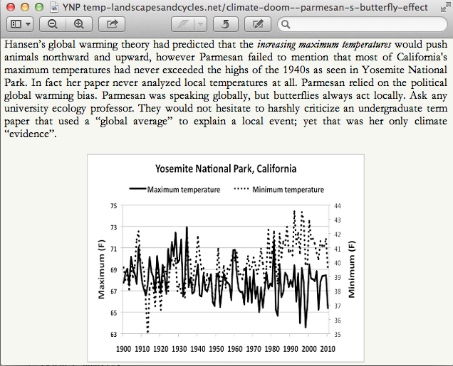"She (Dr. Parmesan) had blamed “global” warming even though most maximum temperatures in California had not risen significantly.[3]"