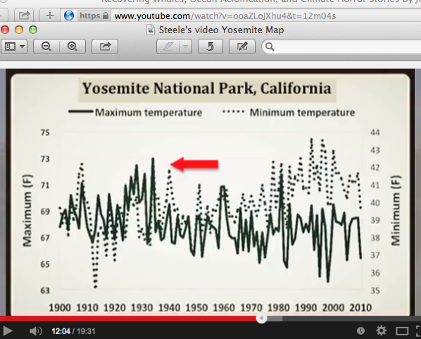 11:40 Steele says: "Yet, she was blaming global warming. That didn't make any sense to me. She also said this was consistent with the global warming theory. Again she used this top down global average to explain a local event. But if you look at Yosemite data, it's very similar to what I had in Tahoe City. If you look at what the 30s were, they were much warmer than we see now. So how do you blame global warming."