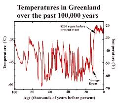 Figure 1. Average Yearly Temperatures in Greenland over the past 100,000 Years as inferred from Oxygen isotope analysis of the GISP2 Greenland ice core. Source: Cuffey, K.M., and G.D. Clow, "Temperature, accumulation, and ice sheet elevation in central Greenland throughout the last deglacial transition", Journal of Geophysical Research, 102, 383-396, 1997.