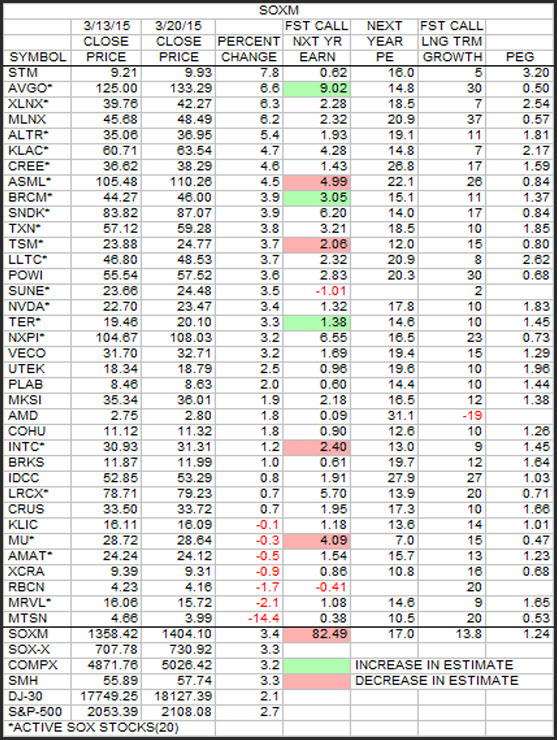 This is the weekly look at the SOXM stocks in terms of earnings estimates, growth estimates, and price changes sorted by price percent change.