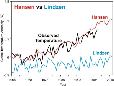 Comparison of the observed NASA temperature record (black) with temperature predictions from Dr. James Hansen's 1988 modeling study (red), and with my reconstructed temperature prediction by Dr. Richard Lindzen based on statements from his talk at MIT in 1989 (blue). Hansen's Scenario B projection has been adjusted to reflect the actual observed greenhouse gas concentrations since 1988. SkepticalScience.com Between mainstream climate scientists like Hansen and contrarian climate scientists like Lindzen, it's clear who has the better track record in making accurate climate predictions. Lindzen has made a career of being wrong about climate science, and he's who The Weekly Standard is relying on to evaluate the risks posed by climate change.