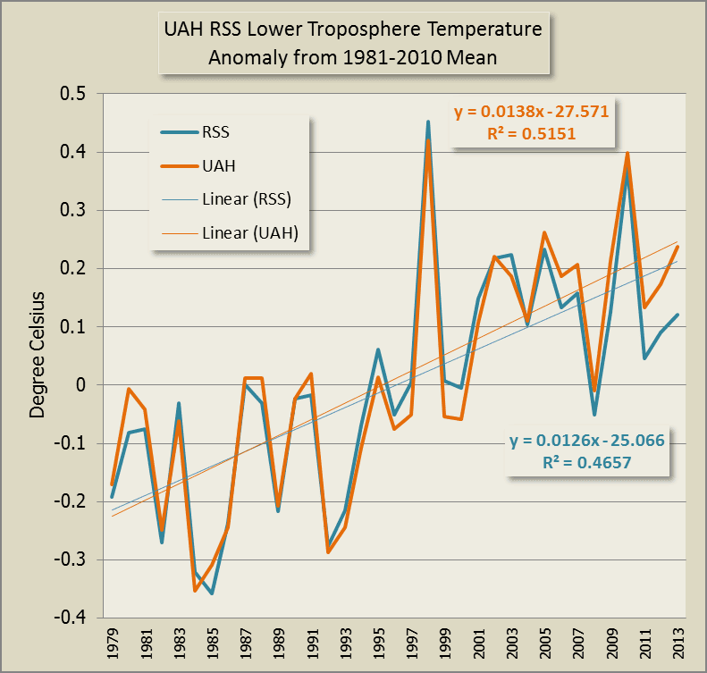 And here is a comparison of RSS and UAH annual temperature anomalies from the 1981-2010 baseline - over the full period of lower troposphere temperatures. You might be interested to know that from 1998 to 2013 (inclusive), with both UAH and RSS there were seven years where the annual temperatures were below their respective rising trend lines and nine years where the annual temperature was above the rising trend lines. I'm not trying to make any particular point here. Just figured you'd like to see what is occupying the collective mind of the denialati at WUWT. Just the same, for anyone who thinks that the rise in global temperatures has stalled, I suggest you read this article by Tamino and check out the updated Cowtan and Way analysis .blog.hotwhopper.com