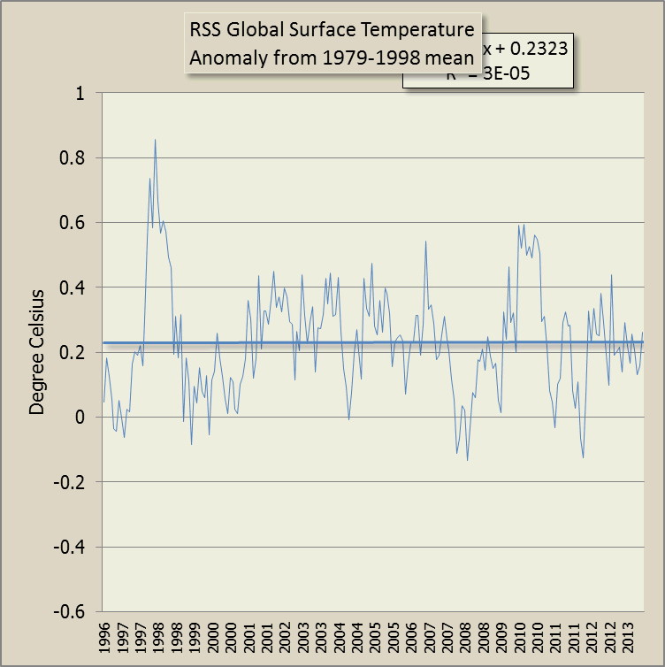 To: Brumar89 who wrote (845333 ) 3/25/2015 10:40:44 PM From: Wharf Rat Read Replies (1) | Respond to of 1573454 "Are you stupid?" You sound like Durst in his bathroom video. When are you gonna try out a bottle of TVMOB's snake oil? = Much to the dismay of Christopher Monckton and his illiterati fans at WUWT, it's still not cooling Sou | 10:09 PM February 7, 2014 Christopher Monckton bemoans the fact that except on a few raggedy science denying blogs, there are no headlines screaming that the lower troposphere "hasn't warmed" in 17 years and five months. He can't manage to get his charts to show cooling but he's managed to show "no warming" since September 1996. ( Archived here .) Christopher put up one of his favourite familiar looking charts: Christopher carefully explained to his readers what it all means, especially the significance of the "bright blue horizontal line", in case they missed it: Taking the least-squares linear-regression trend on this dataset (the bright blue horizontal line through the dark blue data), there has now been no global warming – at all – for 17 years 5 months. For all the RSS watchers out there, here is an animation of the monthly RSS chart starting with the same period that Christopher used and stepping back 12 months at a time to when the satellite record began. Note the heading should read RSS Lower Troposphere Temperature . (It took too long to prepare so I'll not bother changing it just to fix the chart title). Data Source: RSS