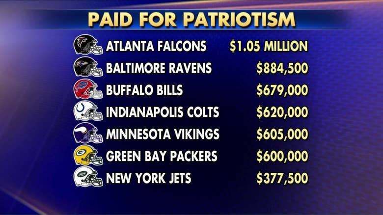 To: Bill who wrote (856195 ) 5/11/2015 10:06:48 PM From: TideGlider Respond to of 1578552 RPT: Military Paid NFL Teams $5.4M to Salute Troops share this email May 11, 2015 // 10:04am As seen on Fox and Friends by Fox News Insider Posted in: // NFL // National Guard // Patriotism The military reportedly paid 14 NFL teams to honor soldiers during football games. Teams were paid $5.4 million over three years to salute troops, with a majority of the money coming from the National Guard. The fourteen teams involved are: Atlanta Falcons - $1.05 million Baltimore Ravens - $884,500 Buffalo Bills - $679,000 Indianapolis Colts - $620,000 Minnesota Vikings - $605,000 Green Bay Packers - $600,000 New York Jets - $377,500 Kansas City Chiefs - $250,000 Cincinnati Bengals - $138,960 Dallas Cowboys - $62,500 St. Louis Rams - $60,000 Pittsburgh Steelers - $36,000 Cleveland Browns - $22,500 Miami Dolphins - $20,000 A NJ.com report focused on the Jets’ agreement with the Department of Defense and the New Jersey Guard. NJ.com reported : The agreement includes the Hometown Hero segment, in which the Jets feature a soldier or two on the big screen, announce their names and ask the crowd to thank them for their service. The soldiers and three friends also get seats in the Coaches Club for the game. […] Aside from the Hometown Heroes segment, the agreements also included advertising and marketing services, including a kickoff video message from the Guard, digital advertising on stadium screens, online advertising and meeting space for a meeting or events. Also, soldiers attended the annual kickoff lunch in New York City to meet and take pictures with the players for promotional use, and the Jets allowed soldiers to participate in a charity event in which coaches and players build or rebuild a playground or park. Sen. Jeff Flake (R-Ariz.) called this an egregious and unnecessary waste of taxpayer dollars. “They realize the public believes they’re doing it as a public service or a sense of patriotism,” he said. “It leaves a bad taste in your mouth.”