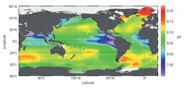 The same report states: “Carbon dioxide in the atmosphere dissolves in the surface waters of the oceans and establishes a concentration in equilibrium with that of the atmosphere. Molecules of CO2 exchange readily with the atmosphere and on average only remain in the surface waters for about 6 years. … Surface oceans have an average pH globally of about 8.2 units. However, pH can vary by ±0.3 units due to local, regional and seasonal factors.” The stated 8.2 ±0.3 number does not match the figure they present shown above.