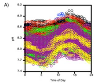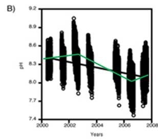 The following figure is from the above study. It shows: A) daily variation in pH, and B) the pH measurements over the years in the study. An alarmist press release for this research stated: “The acidity increased more than 10 times faster than had been predicted by climate change models and other studies” – but they have data observed over a period of only 8 years!