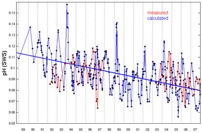 The Hawaii Ocean Time-series began pH measurements in Hawaii in 1992. [ http://hahana.soest.hawaii.edu/hot/trends/trends.html] The following graph is from the graphing page on that web site. The web site does not explain the difference between the “measured” and “calculated” data, but apparently the “calculated” uses other non-pH measurements to calculate pH.