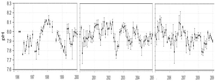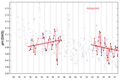 The following figure shows the monthly mean pH measured in the incoming water to the Monterey Bay Aquarium drawn from a ~50ft depth for 1996 to 2009. As can be seen pH varies constantly and shows no trend towards acidification. [ http://sanctuarymonitoring.org/regional_docs/monitoring_projects/100240_167.pdf]