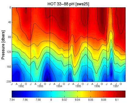 The following figure is from the same web site [ http://hahana.soest.hawaii.edu/hot/methods/fig19.gif] and shows the pH profile with depth from 1992 to 1997. It can be seen here that the pH was increasing from 1992 to 1997, which matches the “measured” above – not the “calculated”.
