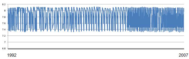The above web site also provides data extraction. The following figure shows the data graphed in Excel (1992 to 2007). The point evident from the data is that annual pH variation greatly exceeds any change over time in this 15-year data set.