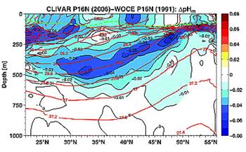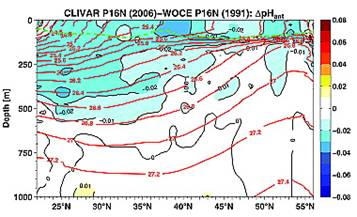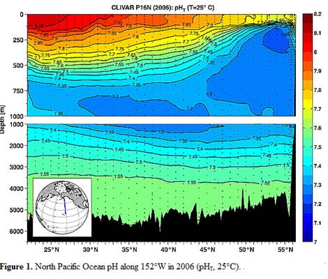 A study reported in 2010 (Byrne et al: “Direct observations of basin-wide acidification of the North Pacific Ocean”, Geophysical Research Letters Vol. 37, 2010 [ http://www.agu.org/journals/gl/gl1002/2009GL040999/]) measured ocean pH along a transect from near Hawaii to Alaska over a period of 15 years. The following Figure 1 is from their paper showing the 2006 pH along the transect.
