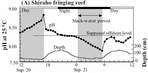 The following figure shows the daily variation in pH for two days at Shiraho reef [ http://www.terrapub.co.jp/e-library/kawahata/pdf/229.pdf]