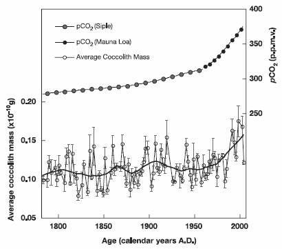 [ http://www.sb-roscoff.fr/Phyto/index.php?option=com_docman&task=doc_details&gid=418&Itemid=112]) states: “From the mid-Mesozoic, coccolithophores have been major calcium carbonate producers in the world’s oceans, today accounting for about a third of the total marine CaCO3 production. Here, we present laboratory evidence that calcification and net primary production in the coccolithophore species Emiliania huxleyi are significantly increased by high CO2 partial pressures. Field evidence from the deep ocean is consistent with these laboratory conclusions, indicating that over the past 220 years there has been a 40% increase in average coccolith mass.”