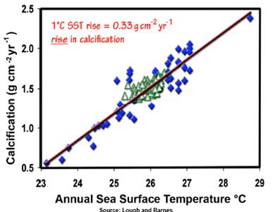 A study of calcification of corals on the Australian Great Barrier Reef (Lough, J.B. and Barnes, D.J. 2000. “Environmental controls on growth of the massive coral Porites”, Journal of Experimental Marine Biology and Ecology 245: 225-243) states: “The response of calcification rate to temperature remained linear. Variation in annual average SST accounted for 84% of the variance. For each 1°C rise in SST, average annual calcification increased by 0.33 g cm-2 year-1 and average annual extension increased by 3.1 mm year-1 (c.f. average values of 1.50 g cm-2 year-1 and 11.6 mm year-1, respectively). The sensitivity of calcification rate in Porites to SST, combined with observed 20th Century increases in SSTs, suggests that calcification rates may have already significantly increased along the GBR in response to global climate change.” Contrary to the doomsday models, empirical evidence shows an increase in calcification. [http://www.sciencedirect.com/science?_ob=ArticleURL&_udi=B6T8F-3YN92RJ-6&_user=10&_rdoc=1&_fmt=&_orig=search